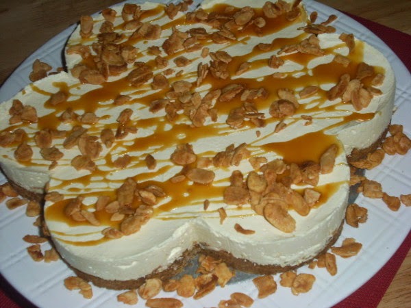 نفرغ الخليط على البسكويت نبسطه و ندخله الى الثلاجة لمدة ليلة كاملة عند التقديم نزينه بالكراميل و اللوز محمر