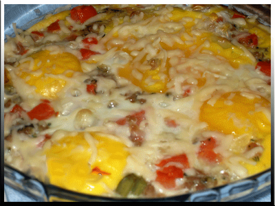 طبق خفيف و سهل : مكون من الكفتة أو اللحم المفروم, البيض, الطماطم, الفلفل الحلو و التوابل