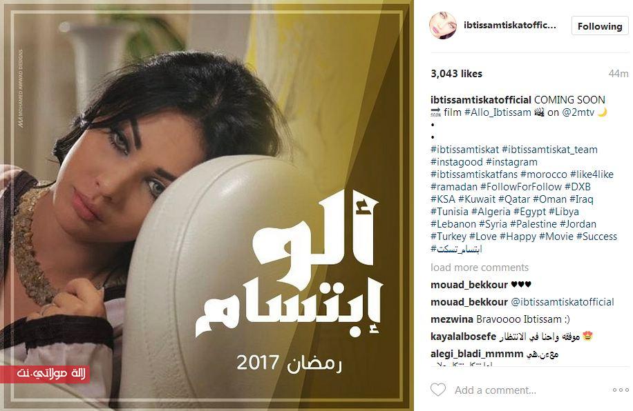نشرت النجمة المغربية ابتسام تسكت، عبر حسابها الشخصي إنستغرام الملصق الدعائي الرسمي لفيلم “ألو ابتسام”، وعلقت عليها قائلة “قريبًا فيلم ألو ابتسام”، الذي من المقرر عرضه في رمضان 2017.