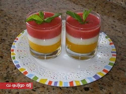 واخيرا الفريز نغسله ونطحنه مع نص كاس صغير من الماء ونضيف له سكر سنيدة ومعلقة كبيرة من مايزينا اي النشا ونفس بنفس الطريقة نضعه فوق النار حتى يعقاد ثم نضيفوه فوق الطبقة الثانية ومدخله للثلاجة حتى يبرد