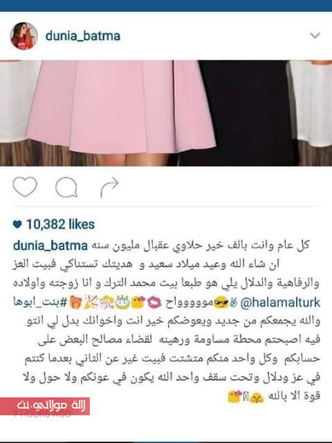 وهنأت النجمة المغربية دنيا بطمة بدورها حلا بهذه المناسبة ونشرت صورة مرفوقة برسالة مستفزة لوالدة إبنة زوجها وقالت فيها: “كل عام وانت بألف خير حلاوي عقبال مليون سنه ان شاء الله وعيد ميلاد سعيد وهديتك تستناكي في بيت العز والرفاهية والدلال يلي هو طبعا بيت محمد الترك وانا زوجته واولاده مووووواح”.