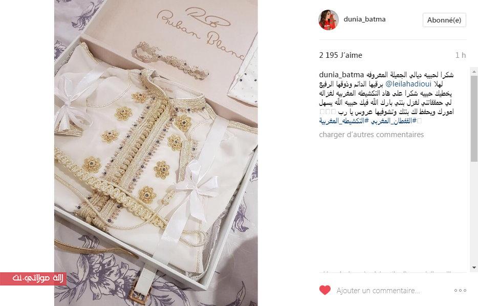 ونشرت بطمة صورة للهدية مرفوقة بعبارات الشكر عبر حسابها الشخصي إنستغرام قائلة: « شكرا الحبيبة ديالي الجميلة المعروفة برقيها الدائم وذوقها الرفيع ليلى الحديوي، لهلا يخطيك حبيبة شكرا على هاد التكشيطة المغربية لغزالة لي حمققاتني لغزل بنتي بارك الله فيك حبيبة، الله يسهل أمورك ويحفظ لك بنتك وتشوفيها عروس يا رب ».