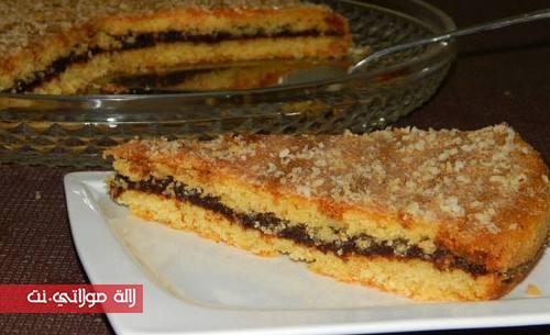 نبسطه على المقلاة ، نطلق التمر فوق السميدة ثم نطلق النصف الثاني من العجينة فوق التمر و نغطيها من الجناب و نرشو السميدة و نذخلها للفرن 30 دقيقة.