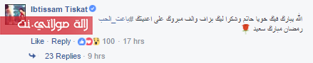 في المقابل ردت ابتسام على منشور حاتم عمور قائلة: ” الله يبارك فيك خويا حاتم وشكرا ليك بزاف وألف مبروك على اغنيتك باعت الحب رمضان مبارك سعيد “.