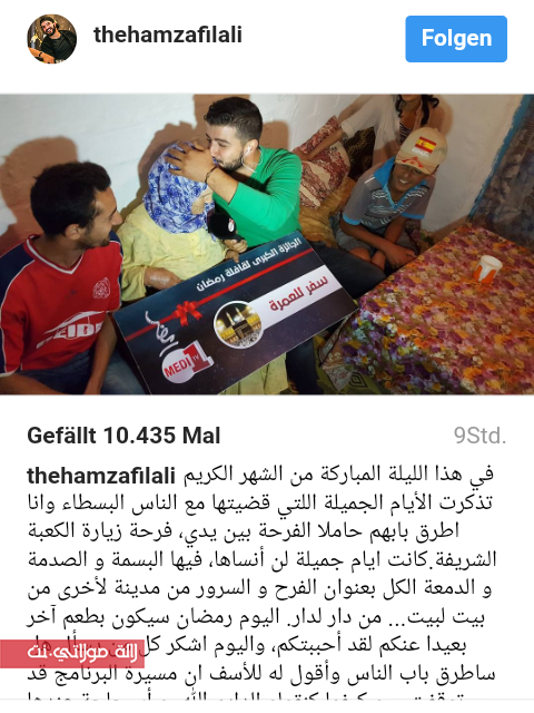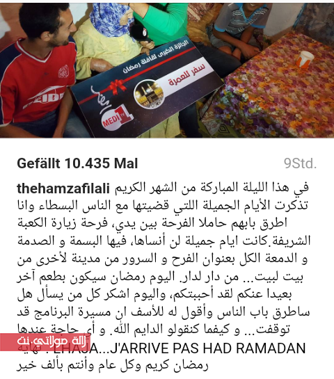ونشر الفيلالي، عبر حسابه الرسمي على موقع التواصل الإجتماعي إنستغرام صورة له من إحدى حلقات البرنامج السابقة ورافقها بتعليق مؤثر قال فيه: ” في هذه الليلة المباركة من الشهر الكريم تذكرت الأيام الجميلة اللتي قضيتها مع الناس البسطاء وأنا أطرق بابهم حاملا الفرحة بين يدي، فرحة زيارة الكعبة الشريفة، كانت ايام جميلة لن أنساها، فيها البسمة والصدمة والدمعة، الكل بعنوان الفرح والسرور من مدينة لأخرى من بيت لبيت… من دار لدار، اليوم رمضان سيكون بطعم آخر بعيدا عنكم لقد أحببتكم، واليوم اشكر كل من يسأل هل ساطرق باب الناس وأقول له للأسف ان مسيرة البرنامج قد توقفت… وكيفما كنقولو الدايم الله وأي حاجة عندها نهاية ” وأضاف: ” الحاجة لن أتي في رمضان”.