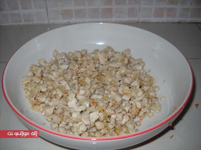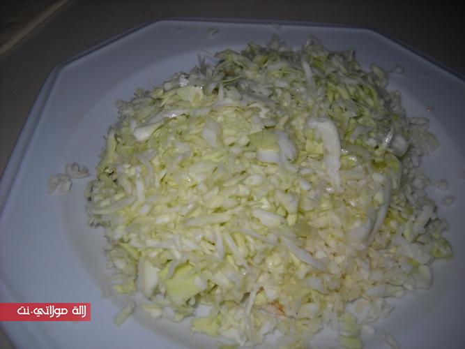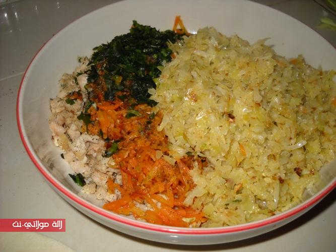 بصل، كرنب، خيزو، معدنوس قزبر محكوكين ومشحرين في الزيت حتى يدبالو ملح وإبزار