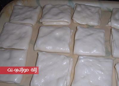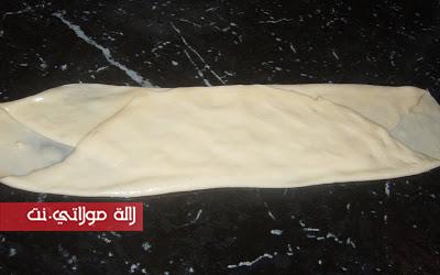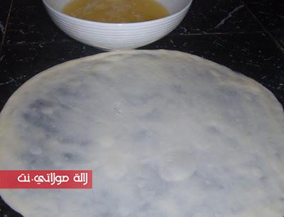 – نعجنو كلشي بالماء دافي و ندلكو جيدا وتبقى العجينة رطبة ونعملوها كويرات صغيرة تم نورقوها ونفرقوها بالزبدة والزيت.