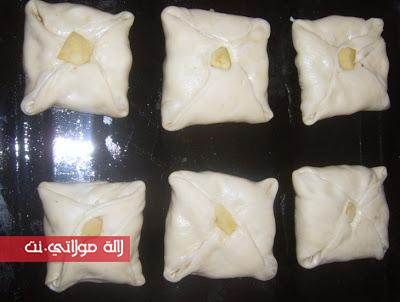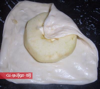 ونضع ربع معلقة زبده وربع معلقةسكر ونعملو فوقها دائرة التفاح بحيت تصبح الزبدة والسكر وسط تقب التفاح ونجمع اطراف المسمن في وسط تقب التفاح لكي تلتصق الاطراف