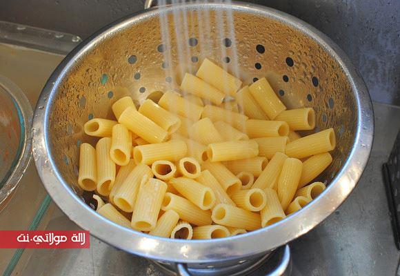 نسلق المعكرونة 10 دقائق فى ماء مغلى وملح، ثم ترفع وتصفى من الماء وتشطف بماء بارد