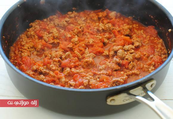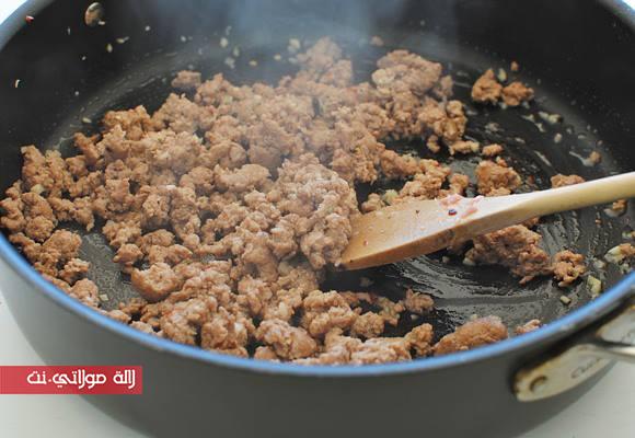 نحضر صوص الكفتة (اللحم المفروم) ونصبه على الوجه، نضغ فوقة جبن الريكوتا، وجبن الشيدر وجبن الموتزاريلا، (و إذا استعملنا البقدونس يفرم ونرشة فوق الجبن)،