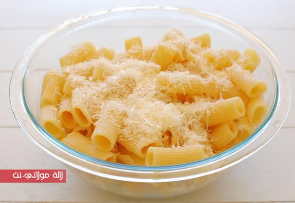 نحضر المعكرونة ،وتوضع فى إناء ونضيف لها جبن البارميزان (أو الجبن الرومي) ونخلطهم معا، ثم نسخن الفرن على 200 درجة،