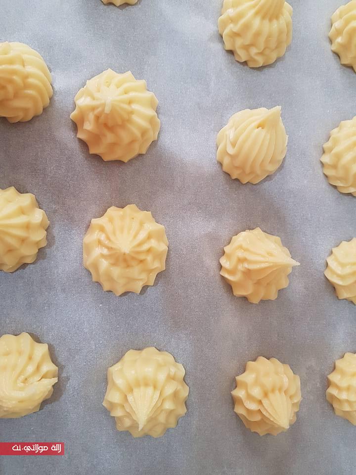 نضع الخليط في جيب حلواني و نعمل من العجين وريدات نضعهم في صينية الفرن
