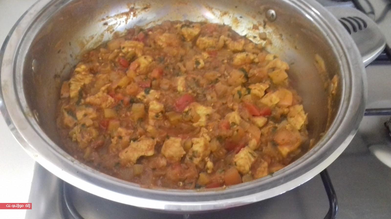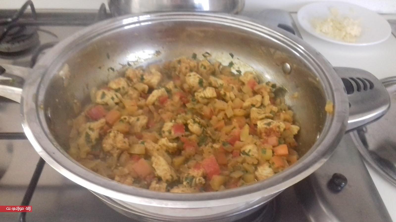 في مقلاة على النار نضع قطع الديك الرومي والبصل و الفلفل مع الزيت و الملح