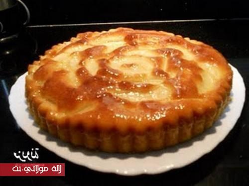 و آخر شي نضيف خميرة الحلوى و نخفق ليتجانس الخليط و نصب الخليط في القالب و نرص قطع التفاح بهذا الشكل :