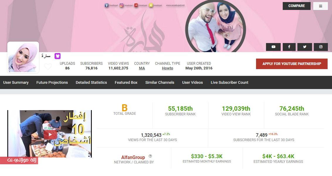 فحسب موقع سوشيل بلايد، فإن قناتهما على اليوتيوب التي تحمل اسم « سارة أبو جاد » قد تحقق إيرادات سنوية مقدرة ب 63،4 ألف دولار أو ما يعادل قرابة ال 62 مليون سنتيم لهذه السنة، وذلك بفضل نسب المتابعات العالية لمقاطع الفيديو التي ينشرها الثنائي عبر القناة التي يتابعها قرابة 77 ألف متابع والتي حصدت إلى حد الساعة أزيد من 11،5 مليون مشاهدة في المجمل.