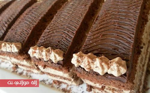 نقسمو الجنواز الى ثلاثة ونسقيوها بالسيرو نعملو كريمة الشانتيي بالشكلاط و نديرو الطبقة الثانية ديال الجنواز و نكررو العملية في طبقة الثالثة نسرحو خليط الشكلاط مع لاكريم فريش و نخاليوه يبرد شوية ونزينوه بخطوط كما توضح الصورة