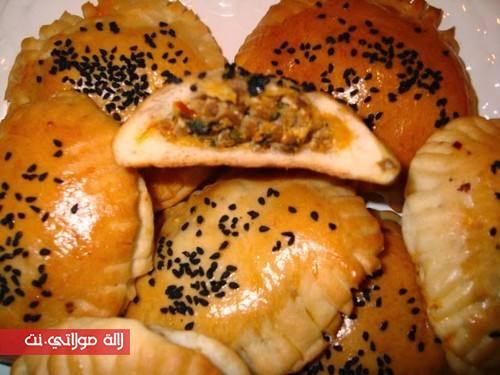 تؤخذ دائرة ويوضع عليها القليل من الحشوة ثم تغطى بدائرة اخرى من العجين