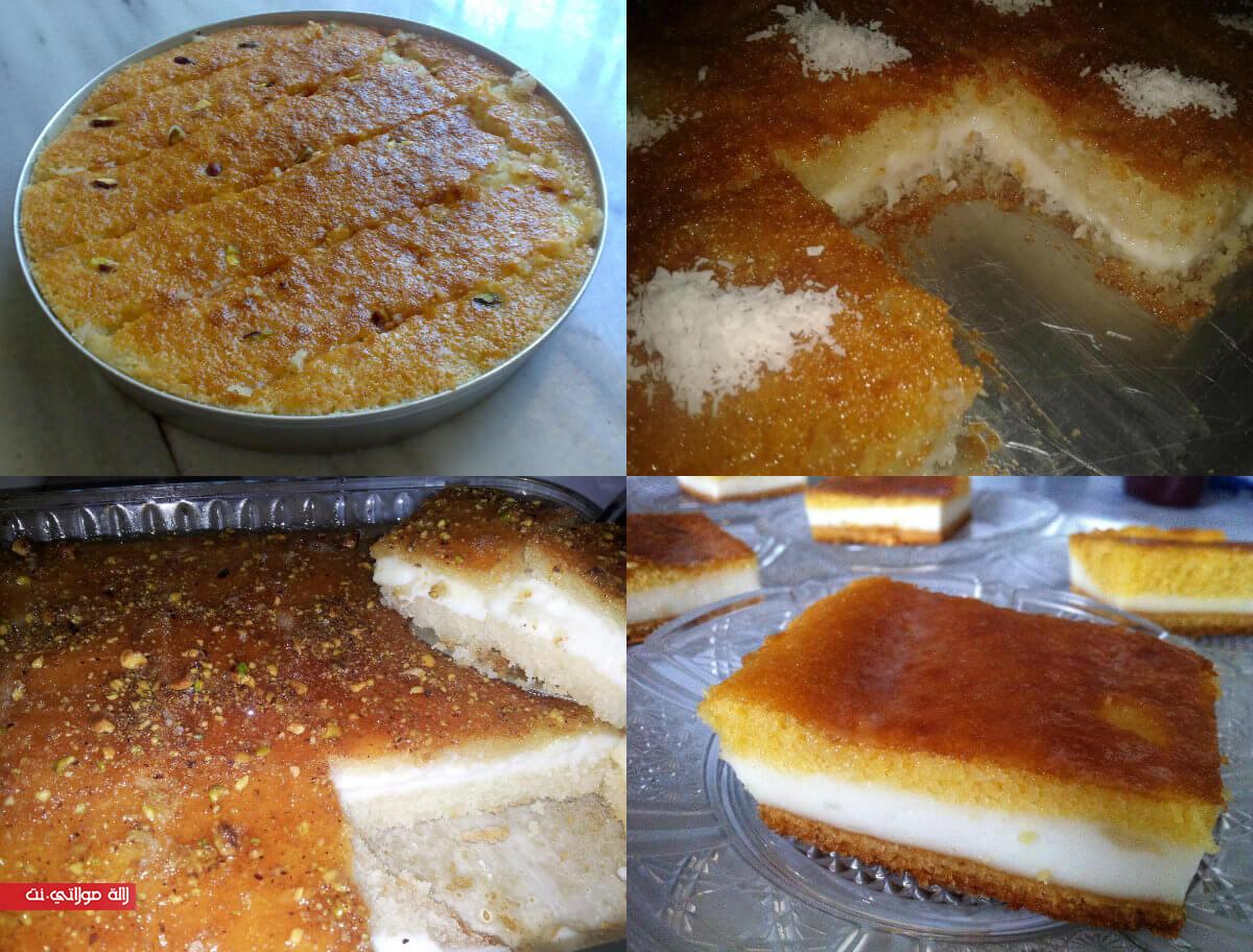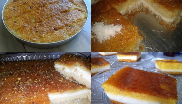 ادهني الصينية بقليل من الزبدة حتى لا تلتصق بالصينية عجينة البسبوسة وتحترق، بعد أن تقومي بصب عجينة البسبوسة في الصينية، لا تسكبيها كلّها حتى تضعي القشطة على وجه عجينة البسبوسة