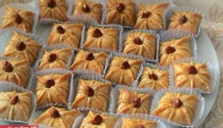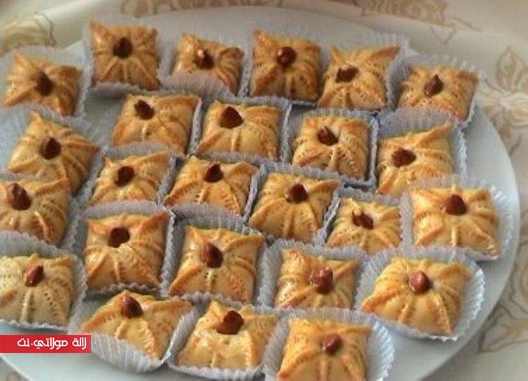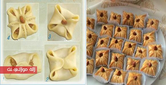 يمدد عجين جيدا نقطع دوائر ونضع وسطها كويرة صغير من عجينة لوز تجمع زواية اربع إلى وسط ونغلق فتحات بضغط باصابع تزين بواسط ملقط مسنن خاص بحلوى(قرفا سة)ثم نضع وسطها لوزة تطهى في فرن متوسط.