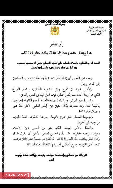 كشف المجلس العلمي الأعلى يوم أمس الاثنين، أن مقدار زكاة الفطر بالنقود لهذا العام ” 1438ه-2017م”، هو 15 درهما كحد أدنى.