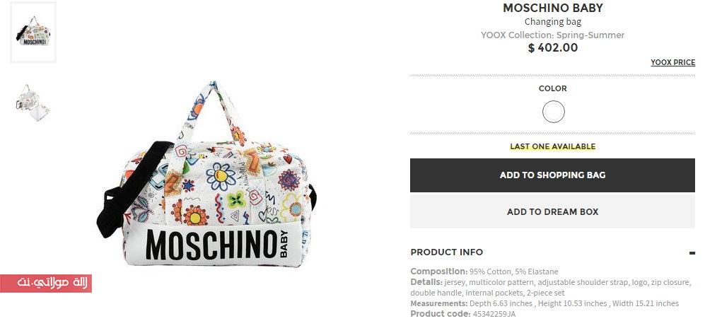 ويبلغ ثمن الحقيبة لوحدها حوالي 4000 درهم، وهي من المجموعة الجديدة لعلامة « موستشينو » والمخصصة للأطفال والرضع.
