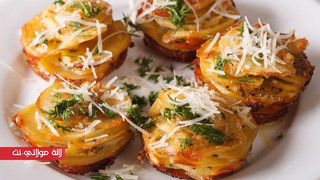 - صفّي 5-6 شرائح من البطاطس فوق بعضها البعض وضعيها في فجوة صينية كب كيك مدهونة بالزبدة.
