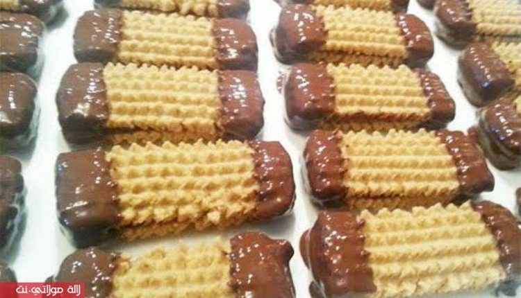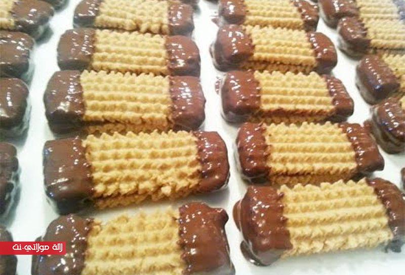 ندوب القهوة في ملعقة كبيرة ماء سخون نجمع كل المكونات حتى نحصل على عجين متماسك ولين نعملو في الألة والمرشم يكون مسنن باش نحصلو على الشكل المطلوب ندخلو الحلوة الفرن حتى يولي لونو فاتح ونخليه يبرد من بعد نلصق وحدة بوحدة بالشكلاط ونزين الجوانب كذلك بالشكلاط وبالصحة والراحة.