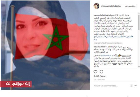أعربت منى عبد الله السابر طليقة المنتج البحريني محمد الترك زوج الفنانة المغربية دنيا بطمة عن حبها الكبير للمغرب ولشعبه، ووجّهت رسالة شكر للمغربيات.ونشرت منى عبر حسابها الرسمي على موقع التواصل الاجتماعي « إنستغرام » صورة لها مع العلم المغربي.ودونت السابر على الصورة بالقول : « حفظ الله بلد المغرب شعبا وقيادة لأن هدا الشعب الطيب تربطني به علاقة مودة واحترام أدام الله عليكم السلم والأمان تحت قيادتكم الرشيدة للملك محمد السادس نصره الله ».وأضافت قائلة : « والشكر طبعا متواصل لكل بنات المغرب الطيبات والعفيفات الراقيات والتي تربطني معهم علاقة طيبة يسودها الاحترام المتبادل شكرا لكم من القلب ».