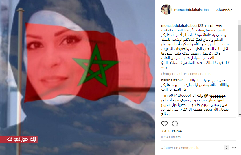 نشرت منى صورة لها بخلفية علم المغرب على حسابها الرسمي بموقع “انستغرام” ورافقتها بتعليق ” حفظ الله بلد المغرب شعبا وقيادة لأن هدا الشعب الطيب تربطني به علاقة مودة واحترام أدام الله عليكم السلم والأمان تحت قيادتكم الرشيدة للملك محمد السادس نصره الله والشكر طبعا متواصل لكل بنات المغرب الطيبات والعفيفات الراقيات والتي تربطني معهم علاقة طيبة يسودها الاحترام المتبادل شكرا لكم من القلب”.