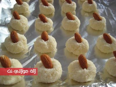 – يوضع جوز الهند في إناء ثم يُصب عليه الحليب المركز ثم يكوّر و توضع عليه حبة لوز