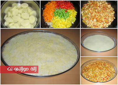 تليها خليط الكفتة والفلفل ثم طبقة البطاطس واخير صلصة البيشاميل والجبن