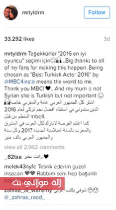 “أشكر كل الجمهور العربي عامة والمغربي خاصة الذين ساندوني في استفتاء أفضل نجم تركي لعام 2016 المنظم من قبل MBC4… كما أغتنم الفرصة لأبارك لكل العرب في المشرق والمغرب بالسنة الميلادية الجديدة 2017 وكل سنة والجمهور العربي بالف خير”.