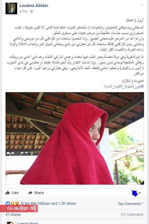 كشفت الفنانة المغربية لبنى أبيدار في تدوينة نشرتها على حسابها بموقع التواصل الإجتماعي « فسيبوك »، أن سبب غيابها يرجع لكونها تعاني من مرض وصفته بـ « الخبيت » أصابها على مستوى الحنجرة.
