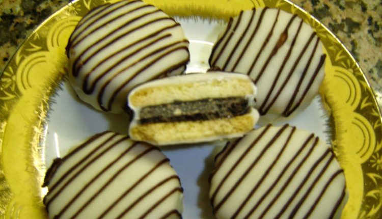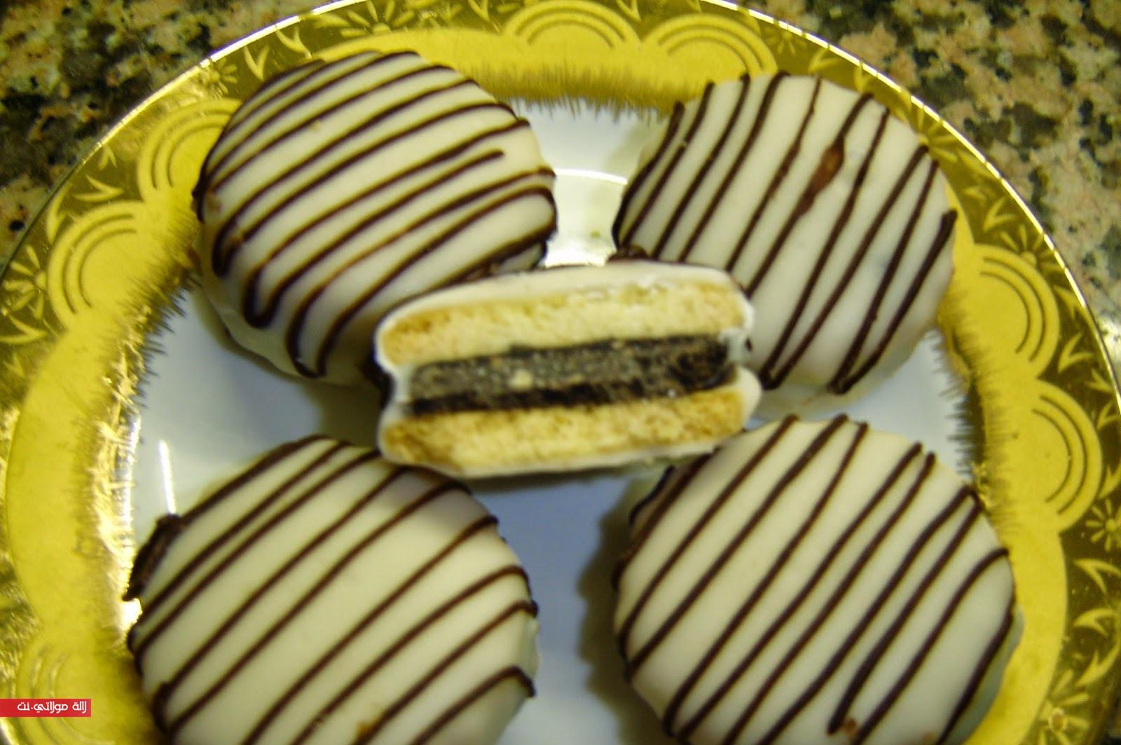 نلصقوا كل جوج( بالشكلاط مذاب في بان ماري مع بسكوي مطحون) تم نغطسوا الحلوة في الشكلاط ابيض مذاب ملي يقصاح نعملوا خطوط بالشكلاط اسود.