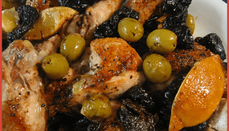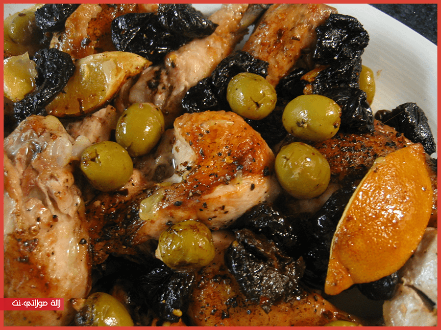 5 فى طاجن للفرن نضع الدجاج ومعه البرقوق والزيتون الاخضر ونضعه فى الفرن الى أن يأخذ الدجاج لون ذهبى شهى.