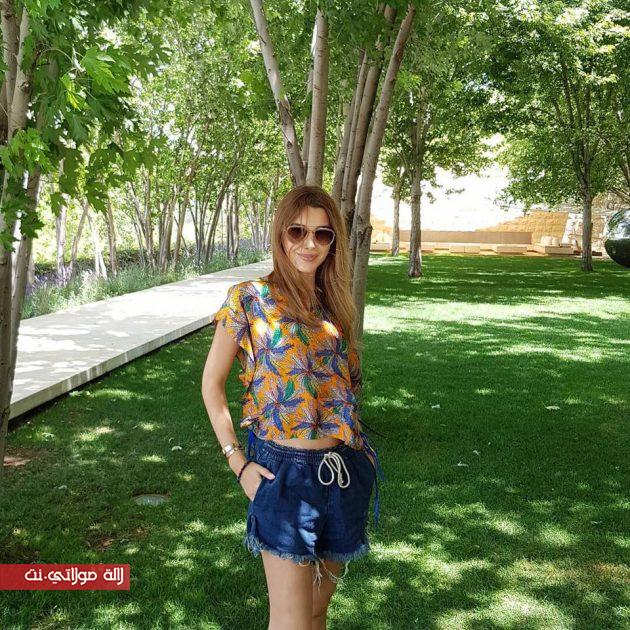 ارتدت نانسي في الصورة شورتاً قصيراً من الجينز، وبلوزة تجمع بين اللونين البرتقالي والأزرق.
