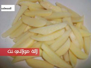 من بعد قطعت بطاطا على شكل فريت و صلقتها لمدة 5 في ماء غليان مملح مع ملعقة خل من بعد صفيتها ودرت معاها شوية ملح +إبزار+شوية تحميرة+ملعقة زيت كبيرة ودرتها فلاطة مدهونة ودخلتها الفران تتحمر كاتجي بحال إلى مقلية .