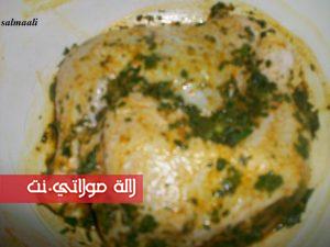 البارح خذيت الدجاج شرملتو بملح+إبزار+سكنجبير +قزبر يابس+ثومة محكوكة+قزبر ومعدنوس مقطع رقيق+عصير نصف حامضة+شوية تحميرة+خرقوم بلدي +3الملاعق كبيرة زيت بلدية نشرملو الدجاج ونخليو تقريبا واحد ساعتين فالثلاجة من بعد نفوروه مني يطيب ندهنوه بالزبدة ولاموطارد وندخلوه إتحمر.