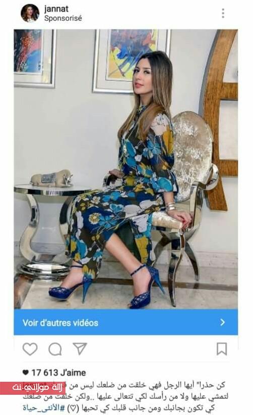 وكتبت « جنات » بصفحتها الخاصة على موقع التواصل الإجتماعي المذكور: « كن حذرا أيها الرجل، فهي خلقت من ظلعك، ليس من قدمك، لتمشي عليها، ولا من رأسك لكي تتعالى عليها، ولكنها خلقت من ضلعك كي تكون بجانبك، ومن جانب قلبك كي تحبها ».ويشار أن جنات مهيد قد احتفلت بزفافها قبل أيام على المحامي المصري محمد عثمان نعمان بحضور الأهل والأصدقاء.جنات مهيد مغنية من مواليد سنة 1986، تعتبر من أبرز المطربات الشابات في الوطن العربي، شاركت لأوّل مرة في مسابقة « نجوم الغد » الغنائية في المغرب، وسطع نجمها سنة 2006، عند إصدارها لألبوم « اللي بيني وبينك »، الذي حصد إعجاب الجمهور العربي، ونال نسبة مبيعات كبيرة.