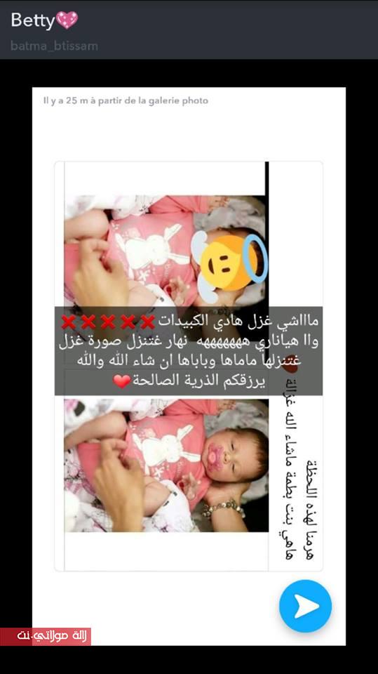 وقالت عبر صفحتها على « سناب شات »: « ماشي غزل هذه الكبيدات، واهيا ناري ههه، نهار غتنزل صورة غزل، غتنزلها ماماها و باباها، إن شاء الله، والله يرزقكم الذرية الصالحة ».وكانت صورة طفلة صغيرة انتشرت مؤخرا أثارث شكوك متابعي دنيا بطمة على مواقع التواصل الإجتماعي، إذ رجح كثير من هؤلاء أن تكون ابنة الفنانة المغربية والمنتج البحريني محمد الترك.يذكر أن الفنانة المذكورة، وزوجها المنتج محمد الترك يتعمدان إخفاء مولدتهما الجديدة التي اختارا لها من الأسماء اسم « غزل ».دنيا بطمة ستحيي حفلا غنائيا يوم غد الأحد بمدينة مرتيل ضمن فعاليات مهرجان الشواطئ لاتصالات المغرب في دورته الـ 16.