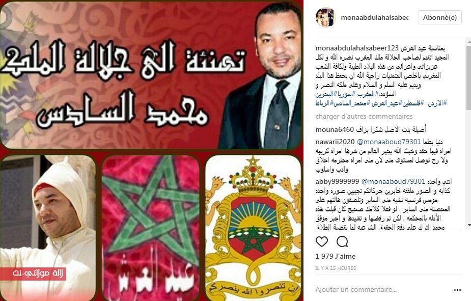 نشرت منى صورة للملك محمد السادس على حسابها بموقع “انستغرام” ورافقتها برسالة تهنئة تقول فيها ” بمناسبة عيد العرش المجيد اتقدم لصاحب الجلالة ملك المغرب نصره الله و لكل عزيزاتي واعزائي من هذه البلاد الطيبة ولكافة الشعب المغربي باخلص المتمنيات راجية الله ان يحفظ هذا البلد ويديم عليه السلم و السلام وعلى ملكه النصر و السؤدد”.