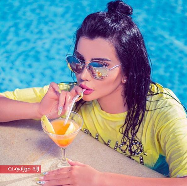 ظهرت جيني في الصورة وهي ترتدي T-shirt أصفر اللون، وتجلس مستمتعة داخل حمام السباحة.
