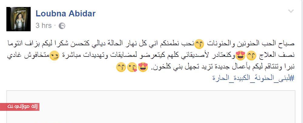 وكتب أبيضار في تدوينتها ”صباح الحب الحنونين والحنونات نحب نطمنكم اني كل نهار الحالة ديالي كتحسن شكرا ليكم بزاف انتوما نصف العلاج وكنعتادر لأصديقائي كلهم كيتعرضو لمضايقات وتهديدات مباشرة متخافوش غادي نبرا وتنتاقم ليكم بأعمال جديدة تزيد تجهل بني كلخون. ”.
