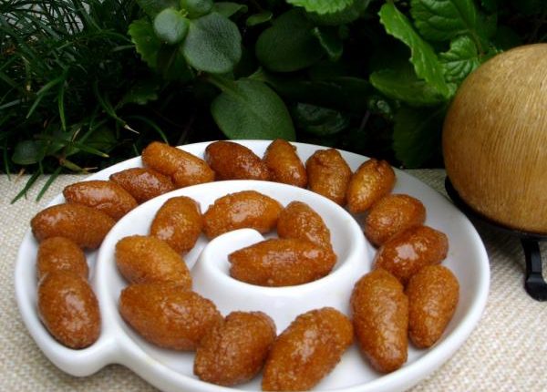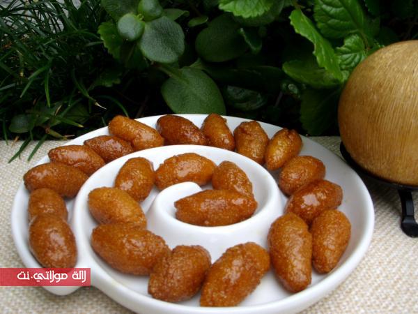 500 غ سميدة رقيقة محمرة شوي+بيضة+2/1 كاس شاي زبدة مدوبة+125 غ سكر بودرة+خمرة الحلوى+قبصة ملح+الحليب باش تجمع الحلوى+زيت للقلي+عسل