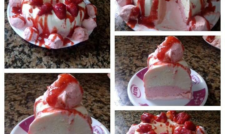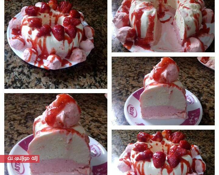 نخفق الحليب جيدا نضيف حليب غبرة والياغورت ثم عصير الحامض حتى يتضاعف ونقسمه الى نصفين الابيض نضيف له الفاني ونسكبه في المول ونعمله في المجمد والنصف الثاني نضيف له صوص الفراولة و2 فلان فريز صغار ونخويوه فوق الطبقة الاولى بعدما بردات ونزين الكلاص بصوص الفريز وحبات الفريز