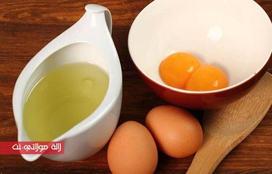 اخفقي البيضتين، وأضيفي زيت الزيتون، ثمّ امزجي المكوّنات مع بعضها. قسّمي الشعر إلى عدة خصلات صغيرة. ادهني كلّ خصلة بمزيج البيض. غطّي كلّ خصلة مدهونة بقطعة من الورق الفضّي لعدد من الساعات. اغسلي شعرك بالماء وشامبو خفيف، وستلاحظي أن شعرك بعد جفافه قد أصبح أملس دون أن تضطري إلى إضافة أي مادة كيميائية صناعية.