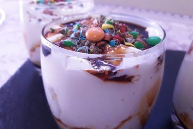عند التزيين نضع كميه من الكريما في الكؤوس المخصصة ونزينه بحبات السمارتيز او شكلاط كيتكات المهروش