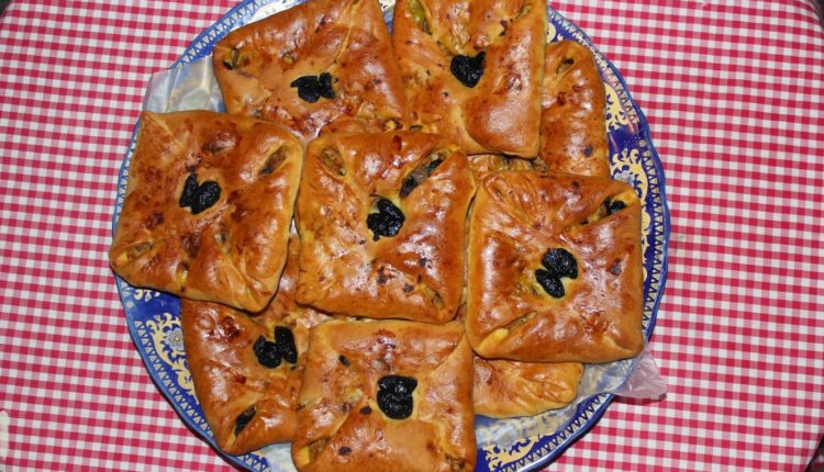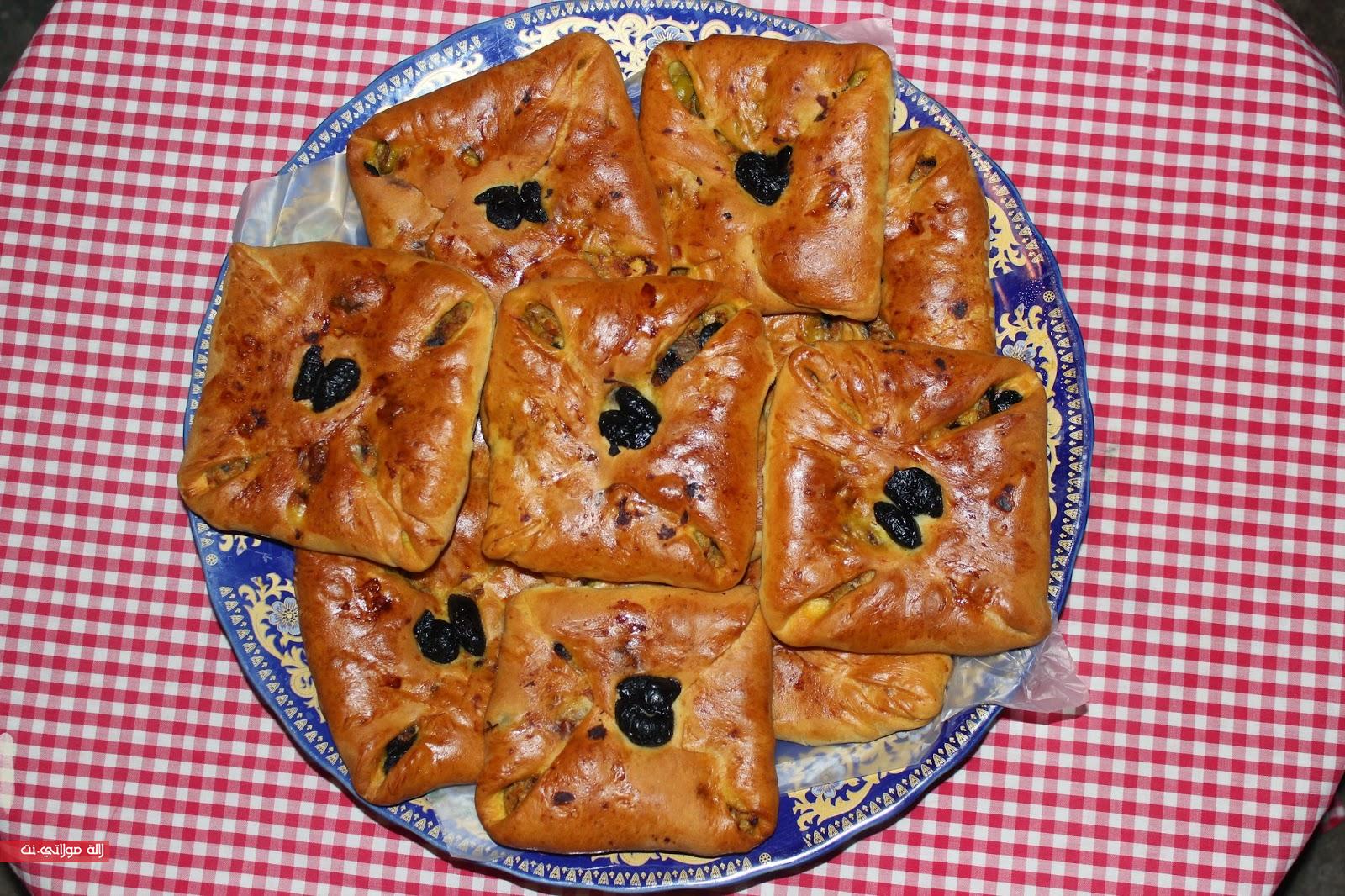 ويوضع قليل من الحشوة وناخذ كل جانب ويلسق بطرف اخر وتزين بالزيتون اكحل