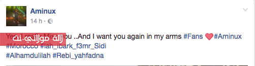 بعد مرضه وغيابه الطويل عن الساحة الفنية، نشر الفنان الشاب أمين التمري المعروف باسمه الفني أمينوكس تدوينة مثيرة عبر صفحته الشخصية على الفايسبوك.وجاءت في تدوينة أمينوكس والتي كتبها باللغة الإنجليزية «أنا حقا اشتقت إليكم وأريدكم مرة أخرى بين ذراعي ».