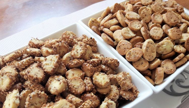 تم نضيف الدقيق تدريجيا هو وخميرة الحلوى الى غاية الحصول على عجين رطب ولا يلتصق باليدين نجهز من العجين كويرات صغيرة تم نشكلها قضيبات طويلة ورقيقة الشكل الاول تركته عادي والتاني دهنته بابيض البيض ومررته في السمسم ندخل العجين الى المجمد مدة ساعة